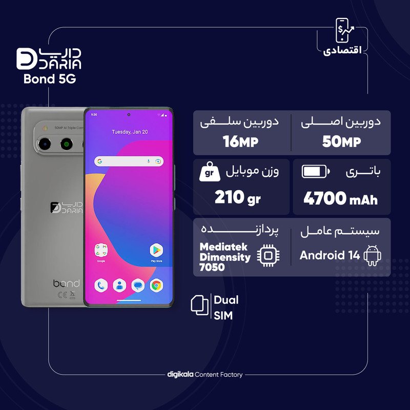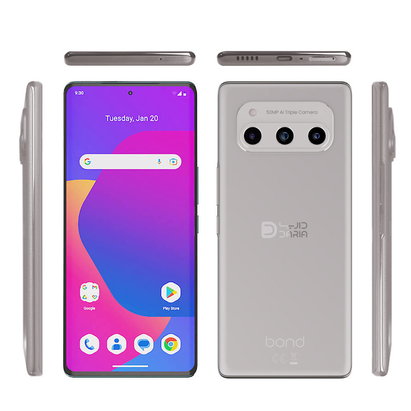 گوشی هوشمند مدل bond، اولین محصول برند داریا است که به صورت رسمی وارد بازار ایران شد. داریا در اولین تجربه تولید گوشیهای هوشمند خود، گوشی میانردهای را روانه بازار کرد که باید بدون هیچ تعریف اضافی بگوییم به نسبت قیمت در نظر گرفته شده از مشخصات فنی بسیار مناسب و حتی قدرتمندی بهره برده است. صفحهنمایش 6.78 اینچی این گوشی با رزولوشن بسیار خوب، نه تنها وضوح تصویر عالی را ارائه میکند، بلکه نرخ بروزرسانی 120 هرتز آن سبب شده تا عملکرد بسیار روان و بدون لگ را شاهد باشیم که تاثیر بسیار بالایی در ارائه هرچه بهتر کیفیت، برای بازیهای سنگین با گرافیک بالا دارد. در قسمت پشتی این گوشی هم شاهد قرارگیری سه سنسور دوربین هستیم که دوربین اصلی قدرتمند 50 مگاپیکسل در کنار سنسور دوربین فوقعریض 8 مگاپیکسل و سنسور 2 مگاپیکسل ماکرو، دوربینهای سهگانه آن را تشکیل میدهند. در بخش فیلمبرداری هم خیالتان راحت باشد، چون داریا bond توانایی ضبط ویدیو 4K را هم دارد. برای دوربین سلفی هم سنسور با رزولوشن 16 مگاپیکسل در نظر گرفته شده که تمام نیازهای شما را برای عکاسی در نور روز برآورده میکند. در بخش مشخصات سختافزاری هم این گوشی به پردازنده دیمنسیتی 7050 شرکت مدیاتک مجهز شده است. پردازنده که در اجرای بازیهای محبوب و نرمافزارهای کاربردی عملکرد بسیار خوب و کاملا قابل قبولی دارد. باتری 4700 میلیآمپرساعت در کنار پشتیبانی از فناوری شارژ سریع 66 وات، از دیگر مشخصات در نظر گرفته شده برای این گوشی هوشمند میانرده است. در مجموع اگر به دنبال خرید گوشی میانردهای هستید که به نسبت قیمت از مشخصات فنی مناسبی بهره برده باشد، بدون شک داریا bond میتواند یکی از بهترین انتخابهای ممکن در این بازه قیمتی باشد. داریا bond تمرکز ویژهای در زمینه web 3 داشته که شما با عضویت در این اکوسیستم، میتوانید با برخی فعالیتها مثل تماس تصویری، تماس تلفنی و ...، امتیاز کسب کنید و در نهایت از این امتیازهای برای یک سری ویژگیهای جذاب استفاده کنید. همچنین به 15 گیگابایت فضای ابری رایگان و رمزنگاری شده دسترسی خواهید داشت. جدیدتری سری این گوشی به همراه سیستم عامل اندروید 14 و رابط کاربری Daria OS 5 عرضه میشود، اما در صورت نصب بودن اندروید 13 و رابط کاربری نسخه قبل، میتوانید آن را به نسخه جدیدتر ارتقا دهید.