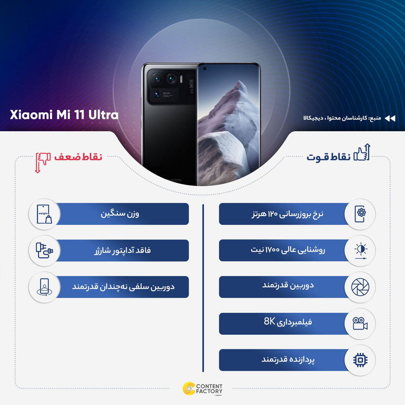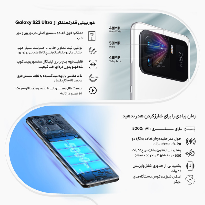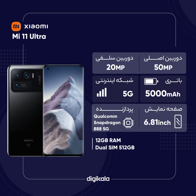 شیائومی Mi 11 Ultra یکی از قدرتمندترین گوشیهای هوشمند این شرکت است که در جایگاه یک گوشی پرچمدار، توانایی ارائه عملکرد بسیار خوبی را دارد. این گوشی به صفحهنمایش با ابعاد 6.81 اینچ و رزولوشن 1440×3200 پیکسل از نوع AMOLED مجهز شده است. صفحهنمایش بسیار باکیفیت که توانایی نمایش 515 پیکسل در هر اینچ و نرخ بروزرسانی 120 هرتز را دارد. روشنایی 1700 نیت (شمع در متر مربع) هم از دیگر قابلیتهای جذاب این صفحهنمایش است. در قسمت پشتی این گوشی شاهد قرار گیری سه سنسور دوربین هستیم که توانایی ارائه عملکرد فوق العادهای را دارند. یک سنسور دوربین اصلی با رزولوشن 50 مگاپیکسل از نوع عریض در کنار سنسور 48 مگاپیکسل از نوع پریسکوپ تلهفوتو و سنسور 48 مگاپیکسل از نوع فوق عریض (ultrawide) با زاویه دید 128 درجه، سنسورهای دروبین سهگانه شیائومی Mi 11 Ultra را تشکیل میدهند. برای دوربین سلفی هم سنسور با رزولوشن 20 مگاپیکسل در نظر گرفته شده است. حضور پردازنده قدرتمند اسنپدراگون 888 5G شرکت کوالکام سبب شده تا شیائومی Mi 11 Ultra بهراحتی از پس سنگینترین بازیهای ممکن روز دنیا بربیاید و از طرفی امکان پشتیبانی از شبکههای اینترنتی نسل پنجم یا همان 5G را هم داشته باشد. باتری با میزان ظرفیت 5000 میلیآمپرساعت هم از دیگر مشخصات در نظر گرفته شده است. پشتیبانی از فناوری شارژ سریع 67 واتی سبب شده هم تا شارژ صفر تا صد درصدی باتری در مدت زمان بسیار کوتاه 36 دقیقه انجام شود.