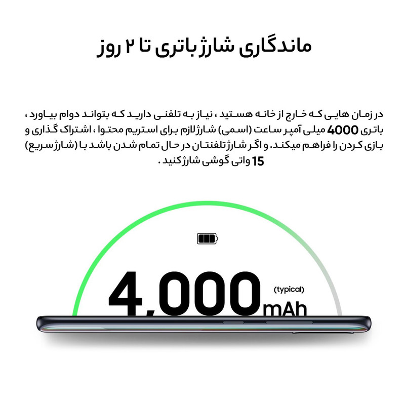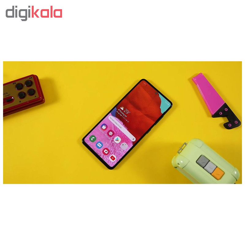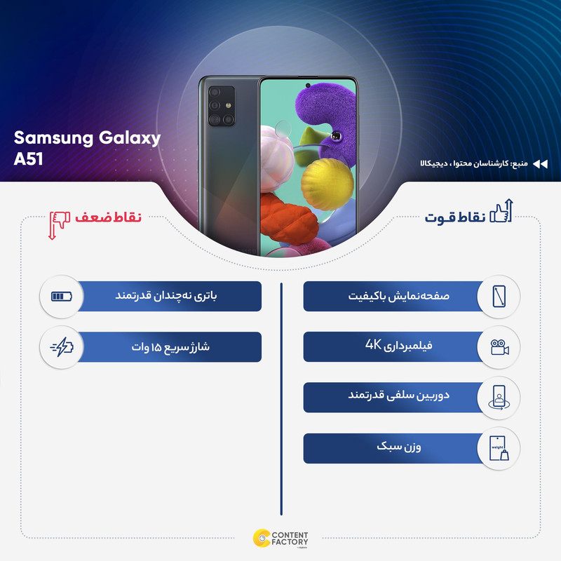 شرکت سامسونگ گوشی موبایل Galaxy A51 با رم 8 گیگابایتی را از تاریخ 12 دسامبر 2019 روانه بازار کرده است. این محصول دارای صفحهنمایش سوپر آمولد است و ظاهر زیبایی دارد. سامسونگ تلاش کرده است حاشیه را در این تولید جدید خود تا حد امکان کم کند. این گوشی قاب پشتی از جنس پلاستیک دارد و قاب جلویی آن را شیشه پوشانده که البته جلوهی زیبایی به گوشی داده است. این محصول سامسونگ با نسخه 10 از سیستمعامل اندروید روانه بازار شده است تا از هر نظر گوشی مدرن بهحساب بیاید. صفحهنمایش استفادهشده در این گوشی 6.5 اینچ با رزولوشن FullHD+ است که با استفاده از فناوری Super AMOLED و پنل OLED تصاویر شفاف و بینظیری را به نمایش میگذارد. این صفحهنمایش در هر اینچ 405 پیکسل را نشان میدهد که این یعنی جزئیات و وضوح تصویر عالی است. همچنین روکش این نمایشگر لایهی محافظ Corning Gorilla Glass است که از خطوخش و ضربه جلوگیری میکند. تراشهی این محصول، Exynos 9611 از تراشههای 10 نانومتری سامسونگ است که به همراه 8 گیگابایت رم عرضه میشود. تراشهی گرافیکی Mali-G72 MP3 هم برای پخش ویدئو و بازی مناسب است. این گوشی در دو ظرفیت 64 و 128 گیگابایتی عرضه شده است و با استفاده از یک کارت حافظهی جانبی قادر خواهید بود حافظه داخلی را تا یک ترابایت دیگر هم افزایش دهید. دوربین اصلی A51 سنسور 48مگاپیکسلی دارد و از نوع عریض (Wide) است. یک سنسور 12مگاپیکسلی و دو سنسور 5 دیگر هم در کنار این دوربین اصلی مجموعه دوربینهای قاب پشتی A51 را تشکیل دادهاند. دوربین سلفی 32مگاپیکسلی هم در قاب جلویی این گوشی به کار گرفته شده است. باتری 4000 میلیآمپرساعتی، پشتیبانی از فناوری شارژ سریع 15 واتی، درگاه USB Type-C و حسگر اثرانگشت در زیر قاب اصلی هم از دیگر ویژگیهای این تازهوارد است. سامسونگ در ساخت این گوشی از جدیدترین فناوریهای ساخت گوشی استفاده کرده است تا میانردهای با قابلیتهای نزدیک به یک بالارده خوشساخت را روانه بازار کند.