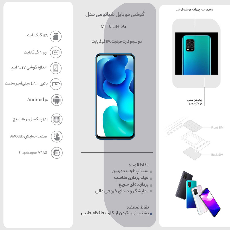 در دنیای امروزی ما، گوشیهای همراه اسمارت یکی از اعضای خانوادههای ما شده و بسیاری از کارهایی که در روزمره انجام میدهیم، الزام به وجود آنها دارد. با پیشرفت تکنولوژی این گوشیها هم روزانه دارای تغییرات و پیشرفت میشوند. یکی از کمپانیهای بزرگ و مطرح در سطح جهانی شیائومی است که گوشیهایی با محبوبیت و طرفداری بالایی تولید میکند و سالانه فروش بسیاری از بازار را بهدلیل کیفیت به خود اختصاص میدهد. گوشی موبایل شیائومی مدل Mi 10 Lite 5G M2002J9G دو سیم کارت ظرفیت 128 گیگابایت یکی از همان گوشیهای باکیفیت این برند است که میتواند تمامی نیازهای ما مانند وبگردی، بازی آفلاین و آنلاین، تماشای فیلم و کلیپ، شبکههای اجتماعی، کار با Applications (نرمافزارها) و بسیاری دیگر را انجام دهید. گفتنی است که این گوشی با تمامی قابلیتهایی که دارد، یک گوشی میانرده است. یکی از ویژگیهای این گوشی باتری آن است. برای گوشی Mi 10 Lite 5G باتری لیتیوم-پلیمری با ظرفیت 4160 میلیآمپرساعت در نظر گرفتهاند که شما میتواند با خیالی آسوده به کار کردن با گوشی بپردازید. شما اگر این گوشی را با باتری ۱۰۰ درصد در اختیار داشته باشد میتوانید در ۱ یا ۳ روز تمامی ظرفیت باتری آن استفاده کنید و این موضوع کاملا به نوع استفاده شما بستگی دارد. از این گوشی میتوانید استفدههای بسیار متنوع و باکیفیتی در عکاسی داشته باشید. پردازنده مرکزی (CPU) و پردازنده گرافیکی (GPU) این گوشی بهاندازهای قدرت دارند که میتوانید بازیهای روز آنلاین و آفلاین با Graphic Map بزرگ و برنامههای محاسباتی و عملیاتی را اجرا کنید. این گوشی دارای ۱۲۸ گیگابایت حافظه داخلی و ۶ گیگابایت حافظه RAM (رَم) است. گوشی شیائومی Mi 10 Lite 5G دارای دوربین چهارگانه در پشت گوشی بوده که دارای کیفیتهای ۴۸، ۸، ۲ و ۲ مگاپیکسل بوده که هرکدام دارای کارایی و استفادهای متفاوتی در انواع عکاسیهای شما هستند. دوربین عکاسی سلفی Mi 10 Lite دارای لنز عریض (Wide) با رزولوشن ۱۶ مگاپیکسل بوده که میتوانید عکاسیهای باکیفیتی از خود، بههمراه دوستان یا در هر محیط و طبیعتی داشته باشید.