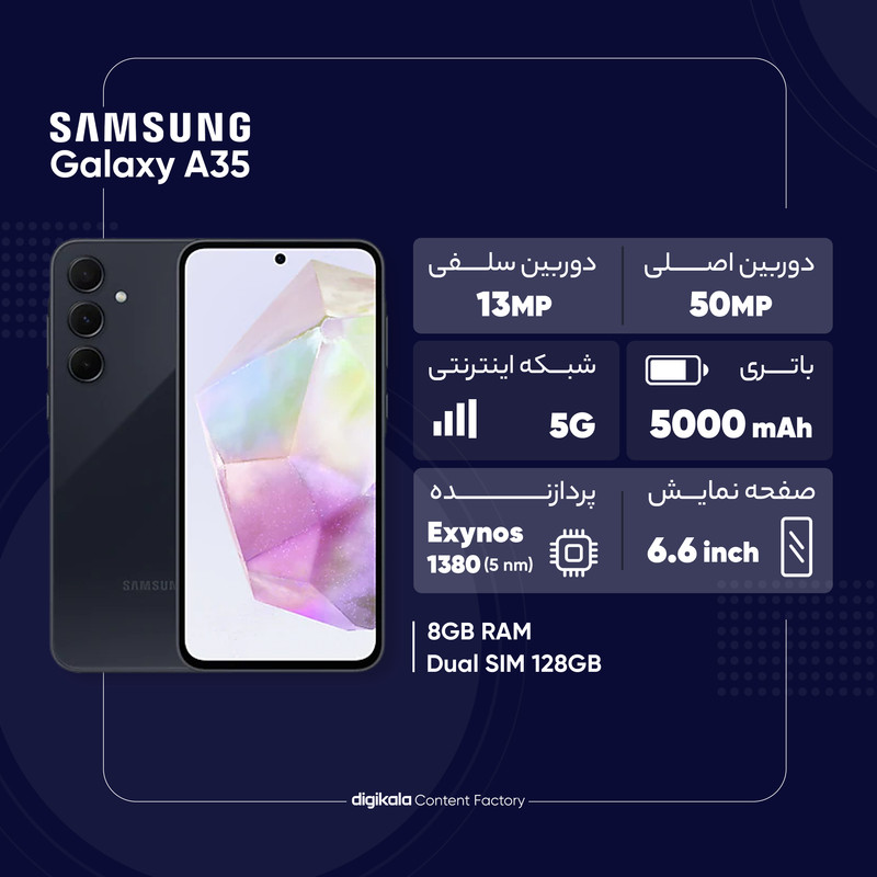 بدون هیچ تعریفی باید بگوییم که گوشیهای هوشمند میانرده سری A سامسونگ توانستهاند با بهره بردن از مشخصات فنی قدرتمند، عملکرد بسیار خوبی را از خود بهنمایش بگذارند. سامسونگ Galaxy A35 یکی از این میانردههای باکیفیت و دوستداشتنی است که به نسبت قیمت در نظر گرفته شده، از مشخصات فنی مناسب و کاملا قابل قبولی بهره برده است. در نمای روبهرویی این گوشی به صفحهنمایش بسیار باکیفیت 6.6 اینچ و رزولوشن 1080×2400 پیکسل از نوع سوپرامولد مجهز شده که توانایی ارائه نرخ بروزرسانی 120 هرتز را هم دارد. با توجه به مشخصات در نظر گرفته شده شما شاهد وضوح تصویر بسیار خوب و باکیفیت و البته عملکرد بسیار روان و بدون لگ در اجرای بازیهای سنگین و نرمافزارهای کاربردی روزمره خواهید بود. در قسمت پشتی این گوشی هم یک سنسور دوربین اصلی با رزولوشن 50 مگاپیکسل در کنار سنسور 8 مگاپیکسل فوقعریض و سنسور 2 مگاپیکسل ماکرو در نظر گرفته شده که سنسور دوربین اصلی این گوشی بهخوبی توقعات شما را در حد و اندازه یک گوشی میانرده برای عکاسی در نور روز و نور شب برآورده میکند. در بخش فیلمبرداری هم خیالتان راحت باشد، چون دوربین اصلی توانایی ضبط ویدیو با نهایت کیفیت 4K را دارد. برای دوربین سلفی هم سنسور با رزولوشن 13 مگاپیکسل در نظر گرفته شده که باید بدانید که توانایی فیلمبرداری 4K را هم دارد. باتری 5000 میلیآمپرساعتی در نظر گرفته شده هم به ازای هر بار شارژ صد درصدی در حالت استفاده معمولی، زمان آماده بهکار دو روز را در اختیارتان قرار میدهد. در مجموع میتوانیم بگوییم که اگر به دنبال خرید گوشی میانردهای هستید که از مشخصات بسیار خوبی بهره برده باشد و البته طراحی جذاب آن حس و حال استفاده با یک پرچمدار را به شما بدهد، سامسونگ Galaxy A35 میتواند گزینه مناسبی برای شما باشد. همانطور که میدانید، درون جعبه این گوشی خبری از آداپتور شارژر نیست، اما این گوشی بههمراه شارژر 25 وات سامسونگ به فروش میرسد.
