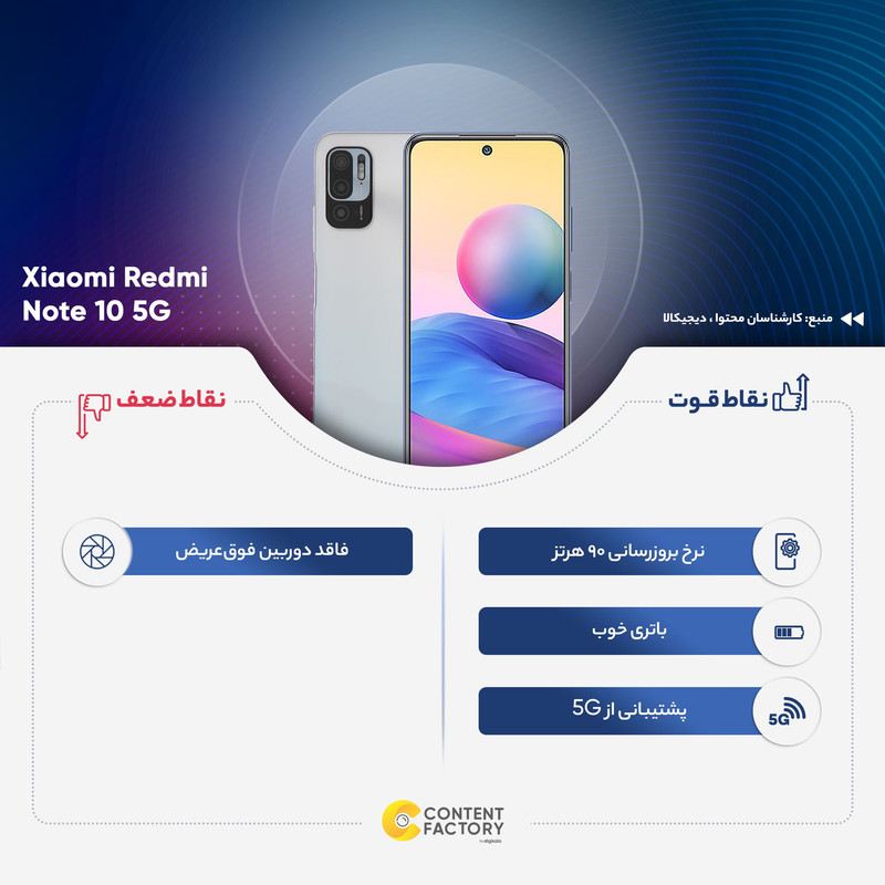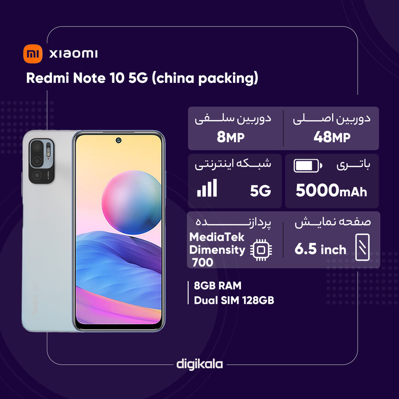 گوشیهای هوشمند میانرده سری Redmi شیائومی بسیار مناسب برای آن دسته از کاربرانی است که میخواهند با هزینهای مقرون بهصرفه گوشی هوشمندی را خریداری کنند که از مشخصات فنی مناسب و عملکرد قابل قبولی بهره برده باشد. Redmi Note 10 5G هم یکی از همین گوشیهای مقرون بهصرفه است. این گوشی به صفحهنمایش با ابعاد 6.5 اینچ و رزولوشن 1080×2400 پیکسل از نوع IPS مجهز شده است. صفحهنمایشی که به لطف نمایش 405 پیکسل در هر اینچ و نرخ بروزرسانی 90 هرتز، عملکرد بسیار خوبی را ارائه میکند. بریدگی دایرهای شکل ناچ اینفینیتی O در قسمت بالایی و مرکزی صفحهنمایش، سنسور دوربین سلفی با رزولوشن 8 مگاپیکسل را در خود جای داده است. این سنسور دوربین سلفی برای ثبت تصاویر در نور روز و برقراری تماسهای تصویری، عملکرد بسیار خوب و قابل قبولی را ارائه میکند. در قسمت پشتی هم یک سنسور دوربین 48 مگاپیکسل از نوع عریض در کنار سنسور با رزولوشن 2 مگاپیکسل از نوع سنجش عمق، سنسورهای دوربین دوگانه این گوشی هوشمند را تشکیل میدهند. همراهی پردازنده دیمنسیتی 700، بهعنوان یکی از بهترین پردازندههای میانرده شرکت مدیاتک، سبب شده تا این گوشی در اجرای بازیهای محبوب و نرمافزارهای کاربردی، عملکرد کاملا قابل قبولی را داشته باشد. باتری با میزان ظرفیت 5000 میلیآمپرساعت هم به ازای هر بار شارژ صد درصدی، توانایی ارائه طول عمر مفید (زمان آماده بهکار) دو روز را در شرایط استفاده معمولی دارد. در مجموع بهعنوان یک گوشی میانرده، Redmi Note 10 5G میتواند یکی از انتخابهای بسیار خوب برای شما باشد.