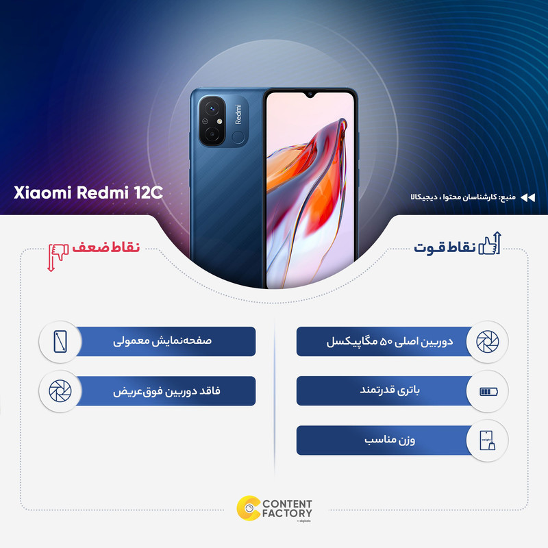 برند شیائومی توانست در عرصه گوشیهای هوشمند میانرده با معرفی محصولاتی متنوع و باکیفیت، عملکرد بسیار خوبی را از خود بهنمایش بگذارد. شیائومی Redmi 12C هم یکی از این گوشیهای میانرده. مقرون بهصرفه است. صفحهنمایش 6.71 اینچ این گوشی با رزولوشن 720×1650 پیکسل و توانایی نمایش 268 پیکسل در هر اینچ، وضوح تصویر مناسب و قابل قبولی را به شما ارائه میکند. حداکثر روشنایی 500 نیت (nits) صفحهنمایش هم سبب شده تا در شرایط نوری متنوع، آیکونها خوانایی بسیار خوبی داشته باشند. در بخش سنسورهای دوربین هم حضور سنسور 50 مگاپیکسل عریض (اصلی) سبب شده تا تصاویر بسیار جذابی را در نور روز و نور شب ثبت کنید. دوربین 0.08 مگاپیکسل از نوع سنجش عمق هم این گوشی هوشمند را همراهی میکند. دوربین سلفی 5 مگاپیکسل هم در نور روز عملکرد مطلوبی دارد و برای برقراری تماسهای تصویری بسیار مناسب است. در بخش مشخصات سختافزاری هم حضور پردازنده هلیو G85 شرکت مدیاتک سبب شده تا شیائومی Redmi 12C عملکرد خوبی در اجرای بازیهای محبوب و نرمافزارهای کاربردی داشته باشد. باتری 5000 میلیآمپرساعت هم به ازای هر بار شارژ صد درصدی، در حالت استفاده معمولی، طول عمر مفید (زمان آماده بهکار) نزدیک به دو روز را ارائه میکند. در مجموع باید بگوییم که شیائومی Redmi 12C بهعنوان یک گوشی میانرده با قیمت به نسبت ارزان، با بهره بردن از مشخصات فنی مناسب و کاملا قابل قبول، میتواند انتخاب بسیار خوبی در بین گوشیهای میانرده این بازه قیمتی باشد.