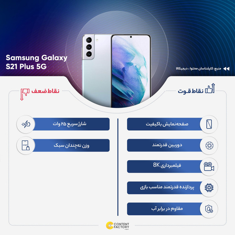 چند سال است که Galaxy Noteهای سامسونگ طرفداران خاص خود را پیدا کرده و با قابلیتهای بالایی به بازار عرضه میشوند. گوشیهای سری نوت سامسونگ، طراحی خاص خود را دارند که آنها را از گوشیهای سری S جدا میکند. همانطور که انتظار میرفت گوشی S21 Plus 5G هم از قاعده طراحی گوشیهای سری نوت پیروی کرده است. گوشی موبایل سامسونگ مدل Galaxy S21 Plus 5G SM-G996B/DS دو سیم کارت ظرفیت 128 گیگابایت از بهروزترین و باکیفیتترین گوشیهای موجود در بازار است طراحی زیبا و کارایی مناسبی دارد. از ویژگیهای این گوشی موبایل میتوان به باتری لیتیومپلیمری با ظرفیت 4800 میلیآمپر اشاره کرد که این میزان شما را از شارژ مداوم گوشی موبایل بینیاز میکند. این محصول قابلیت شارژ سریع با توان 25 وات را دارد و از فناوری شارژ سریع PD نسخه سوم پشتیبانی میکند. از دیگر قابلیتهای گوشی Galaxy S21 Plus 5G SM-G996B/DS میتوان به برخورداری از قابلیت شارژ بیسیم Qi/PMA با توان 15 وات اشاره کرد. دوربین 64 مگاپیکسلی این موبایل آن را برای انجام عکاسی حرفهای هم به گزینهای مناسب بدل کرده است. این گوشی قابلیت شارژ بیسیم دستگاههای دیگر (Power Bank/Reverse Wireless Charging) با توان 4.5 وات دارا است. گوشی موبایل سامسونگ مدل Galaxy S21 Plus 5G دو سیم کارت ظرفیت 128 گیگابایت و رم 8 گیگابایت میتواند شما را در تمامی کارها، بازیها و تمامی عملیات گرافیکی شگفتزده کند. در سری Galaxy S21 شارژر و هندزفری حذف شده است.