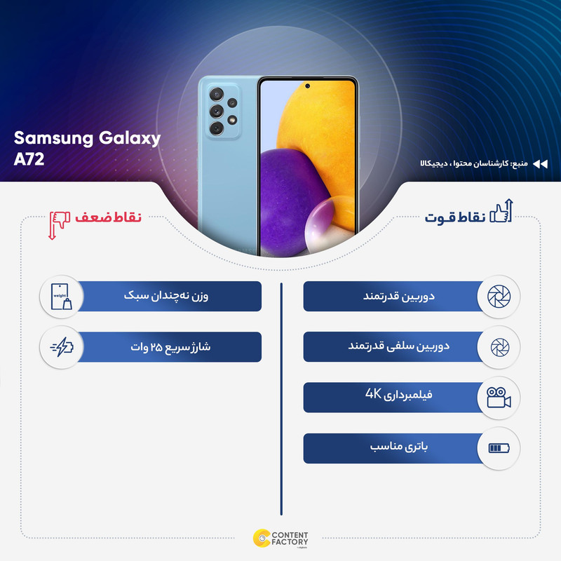گوشی موبایل Galaxy A72 با رم 8 گیگابایتی و حافظه داخلی 256 گیگابایت به عنوان یکی از پرطرفدارترین میانردههای سامسونگ شناخته میشود. این گوشی دارای صفحهنمایش سوپر امولد است و ظاهر زیبایی دارد. سامسونگ تلاش کرده است تا حاشیهی صفحه نمایش را در این گوشی تا حد امکان کم کند. این گوشی قاب پشتی از جنس پلاستیک دارد و قاب جلویی آن را شیشه پوشانده و در مجموع جلوهی زیبایی به ظاهر آن بخشیده است. این محصول سامسونگ با نسخه 11 سیستمعامل اندروید روانه بازار شده است. صفحهنمایش استفاده شده در این گوشی با ابعاد 6.7 اینچ و با رزولوشن FullHD+ است که با استفاده از فناوری Super AMOLED و پنل OLED تصاویر شفاف و بینظیری را به نمایش میگذارد. این صفحهنمایش در هر اینچ 394 پیکسل را در خود جای داده است و در نتیجه جزئیات و وضوح تصویر عالی را از سوی آن شاهد هستیم. همچنین روکش این نمایشگر لایهی محافظ Corning Gorilla Glass است که از خطوخش و ضربه جلوگیری میکند. تراشهی این محصول، Snapdragon 720G از تراشههای 8 نانومتری شرکت کوالکام است که به همراه هشت گیگابایت رم عرضه میشود. تراشهی گرافیکی Adreno 618 هم برای پخش ویدئو و بازی مناسب است. این نسخه از گوشی با حافظه 256 گیگابایتی عرضه شده است. دوربین اصلی A52 سنسور 64 مگاپیکسلی دارد و از نوع عریض (Wide) است. یک سنسور 12مگاپیکسلی و دو سنسور 5 و 8 مگاپیکسلی دیگر هم در کنار این دوربین اصلی مجموعه دوربینهای قاب پشتی A72 را تشکیل دادهاند. دوربین سلفی 32 مگاپیکسلی هم در قاب جلویی این گوشی به کار گرفته شده است. باتری 5000 میلیآمپرساعتی، پشتیبانی از فناوری شارژ سریع 25 واتی، درگاه USB Type-C و حسگر اثرانگشت در زیر صفحه نمایش هم از دیگر ویژگیهای این گوشی است. سامسونگ در ساخت این گوشی از جدیدترین فناوریهای ساخت گوشی استفاده کرده است تا میانردهای با قابلیتهای نزدیک به یک پرچمدار خوشساخت را روانه بازار کند.